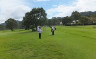 青最終8番ホール、あぁぁ外れたのか?この日も予定通り昼飯前に4コース、モグモグタイムでちょっと一杯飲んで2コース回りこの日のお仕事終了。