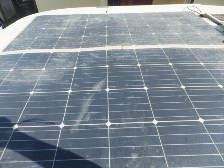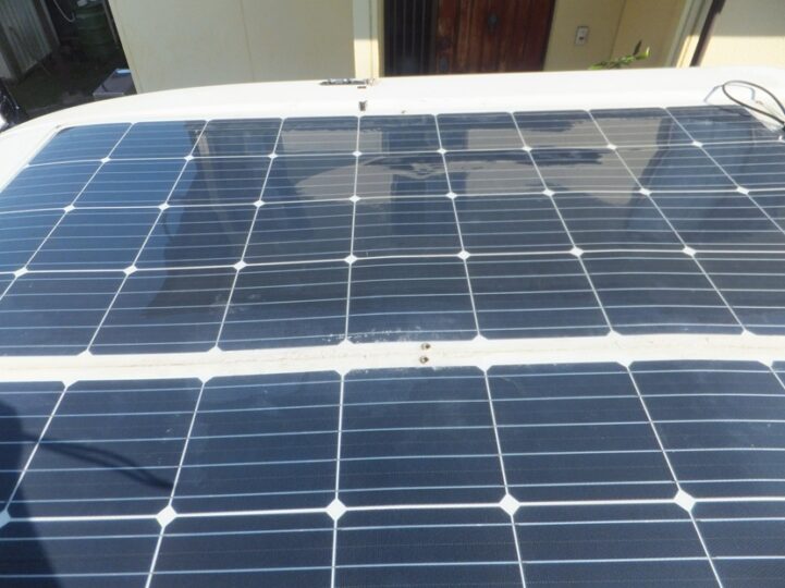昨年の暮れから今年の初めに散々苦労し取り付けたソーラパネル、取り付けの折ヨタヨタしている夢爺さん、マックスファンのフードに手を突きバラバラに、一応修理してみたものの結局は新しいファンと入れかえ、因縁あるソーラパネル、2度と屋根には登らないと決めていたがパネルの汚れが気になり覗いてみた。