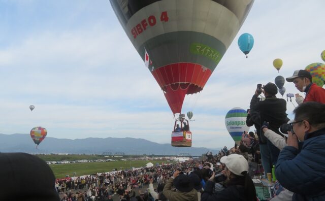 キャンピングカー 「いや~気球ていいもんですね~」大会3日目 第41回熱気球日本選手権 30機・フェスタ部門28機の部バルーンが小さく見えなくなるころ、何と言うことでしょう( ゚Д゚)、皆さんの目線の先にはメイン競技「パシフィック・カップ」71機が会場外からの離陸で会場内に向かう気球が見えてきたではありませんか 2025.11.13 キャンピングカー車中泊