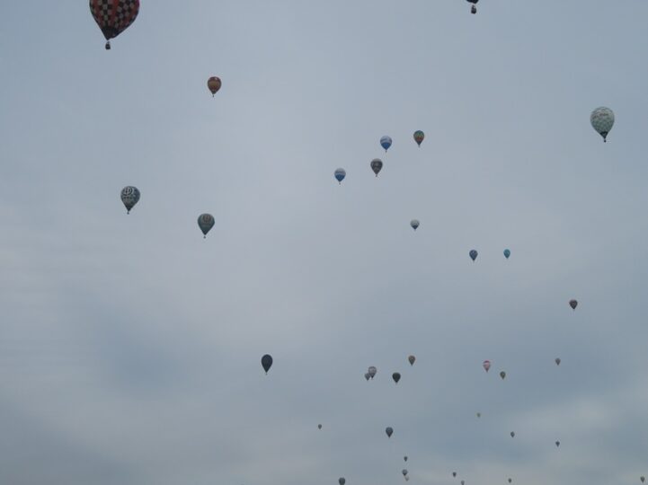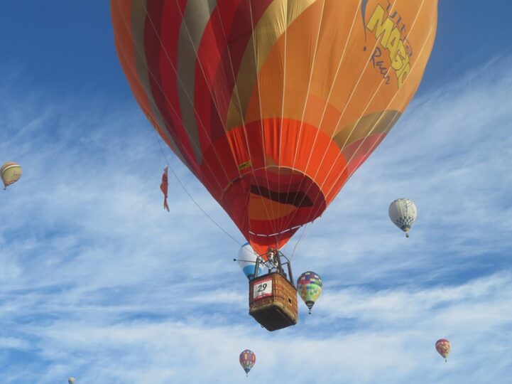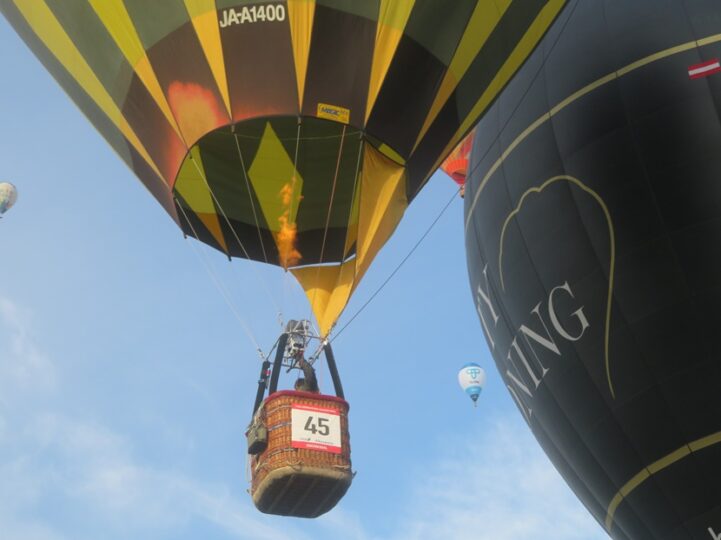 バルーン蘊蓄・なぜ競技は早朝と夕方か?、バルーンにとって風はなくてはならない動力、時として非常に脅威にもなります。太陽が昇り始めて地面が温まると風が出やすく、またサーマル(上昇気流)に巻き込まれるとコントロール不能になり危険。そのためフライトは一般的に、日の出から3時間くらいの風が穏やかな早朝と、日没前2時間くらいの夕方に行われます。