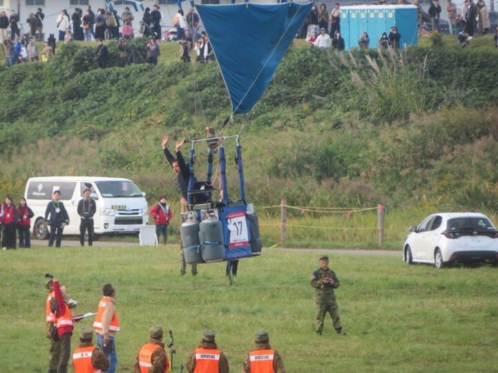 ギリギリまで降下してマーカーを置き観客の「やった~やった~」の掛け声と一緒に\(^o^)/する選手や、ぶれていますね~近くに降りられない選手は遠くからターゲットを目指しマーカーを思いっきり降りまし投げる選手も。ターゲットの中に入ると得点になるが、中には再トライする選手もいるが時間が決まっている、時間を過ぎればターゲットに入っても得点にはならない。