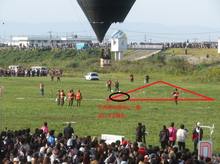 三角形の頂点(黒丸)に一番近くマーカーを落とした選手が一番、正式な計測員が測定する。