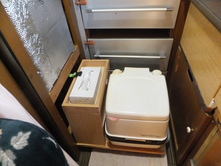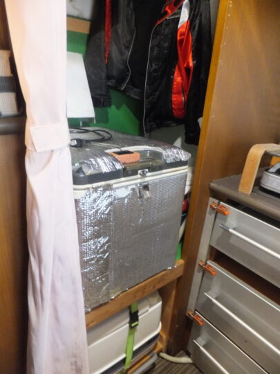 もともとこちらはトイレ・シャワールーム、シャワーを車内で浴びることは全く考えていない夢爺さん、空間を2段に仕切り、上にはエンゲルの冷蔵庫、奥には洋服掛け、その下には飲料水などの置き場に、下にはポータルトイレを引き出し式に設置。引き出せばこのように。