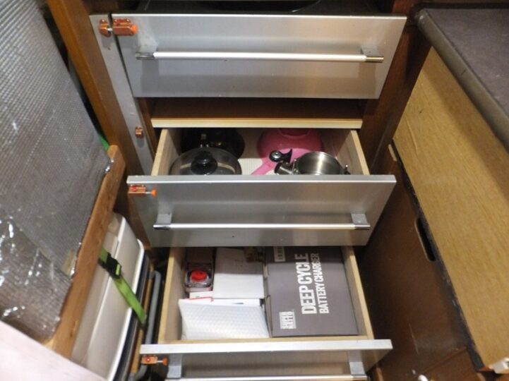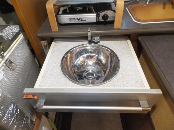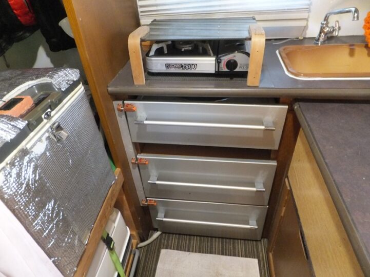 そして洗面はこちらで、元々こちらには古~い100v、ガス、12vで使える3WaY冷蔵庫が設置してあった場所、冷蔵庫はほとんど使うことなくエンゲル冷蔵庫を導入し、冷蔵庫を突っ張らい、空いた空間を3段の引き出しにリニュアル、一番上は洗面台、洗面、歯ブラシ等も今回はこちらで解決。