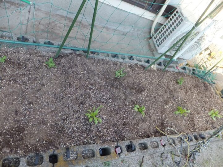 キュウリ植えていた後にスナップエンドウに春菊を植えてある、植えてある?腰がだいぶ良くなっようでキュウリを撤去後に遊ばせておくのも勿体ない”と”言うことで鍋の季節には春菊、夢爺さんの”酒のあて”にスナップエンドウを植えた夢爺さん思いの夢婆さん。