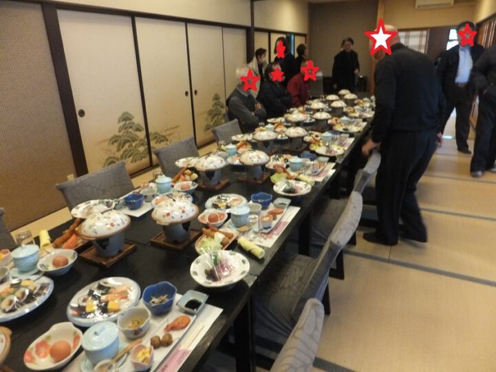 してこの日の楽しがもう一つ、Gゴルフ会員の忘年会、11時20分集合でバスの送迎あり、30分ほどのところ。参加人数18名。