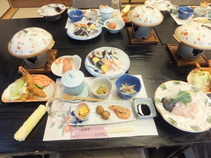 ここは地元では料理が美味しいと評判の懐石料理屋さん、57号線沿い、旬の食材をいかした料理は、どれを食べても絶品、近海で取れた海鮮料理は特に新鮮、このほかに吸い物、天ぷら、タイの塩焼き他いくつか出てきた。もちろん全部は食べきらない、持ち帰りで夕食の分まで十分。夢爺さんは年に一度ほどは同総会やらで行っている。