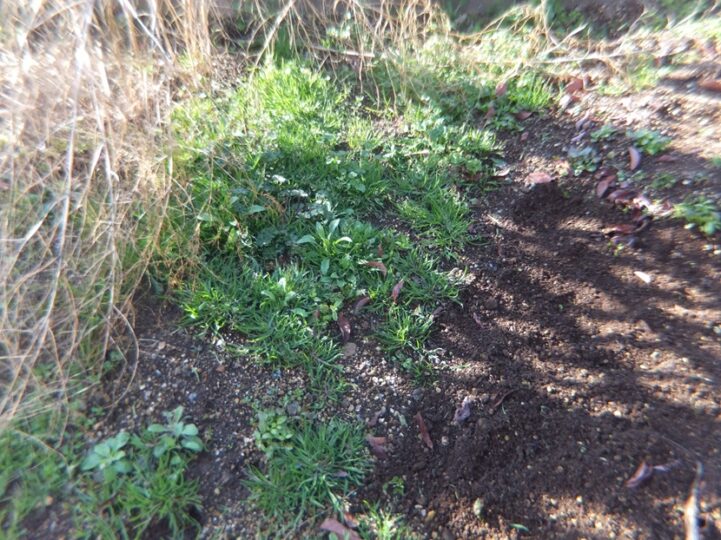 種が付き始めている、種が落ちる前に除草すれば夏場に生える雑草を制御できる。右の写真は梅の木があったところ。