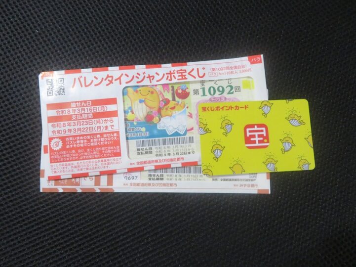 期限切れになるポイントは400ポイントほど、金額にすれば400円、全く持って勿体ない、時は4時40分、お店が閉まるのは5時、急ぎ出かけ「バレンタインジャンボ宝くじ」を購入、買っても当たらん・買わなきゃ当たらん宝くじ、今回は買うつもりはなかったがポイントを1200ポイント使い20枚購入、支払い金額4800円、ぺい〇〇で支払いポイント48ポイント、宝くじポイント48ポイントはゲットした夢爺さんのお話しでした。