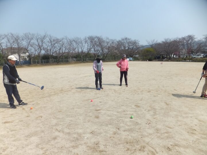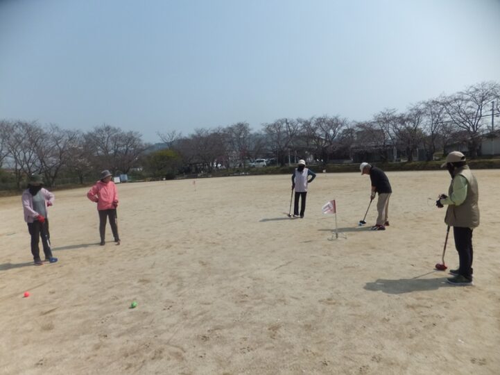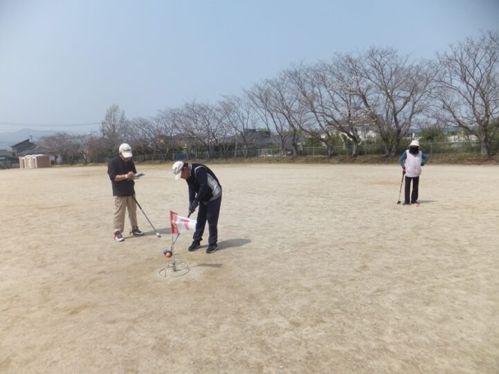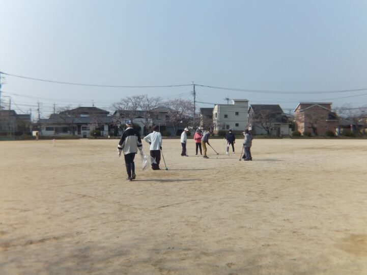 週末土曜日、この日もGゴルフのダブルヘッダー、まず地区の練習に参加し2ホール回る、参加者は14名、7名、2組でまわる。8時半より1時間程。