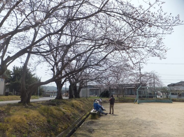 グランド周りには数十本の桜が植えてあるが種類が違うのか1本だけは早く咲き、今では散って新芽が出ている、左の写真、北側?1本の木に数輪が開花している程度だが、右の東側?の桜は3部咲きほど開花してる。早くもベンチでは家族連れか?弁当を広げておられた。